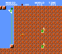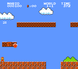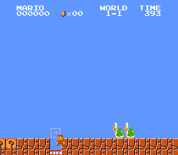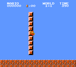 | #06その他 | クリボーからノコノコへの変化 | ![]() オリジナルマリオの1−1で見られる現象です。 まずステージを始めて最初の穴の右までいき、?ブロックを画面の左から3〜5マスまでスクロールさせます。 その後すぐに?ブロックの左のレンガブロックの下まで移動し、二匹並んで歩いてくるクリボーの二匹目を、レンガブロックを使い下から叩きます。 すると、稀にクリボーがノコノコのグラフィックに変化して落ちていきます。 詳細は不明ですが、縦位置と画面のスクロール位置が重要なようです。 |